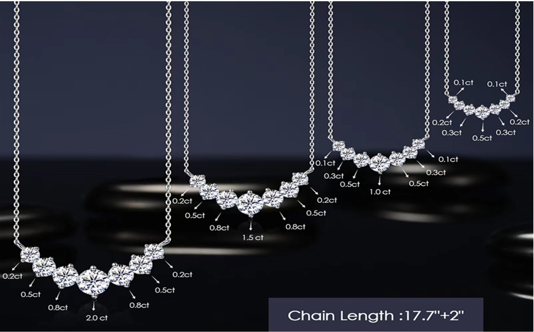 💎【Smile Necklace 】The 1.7Ct smile necklace main drill 0.5CT .The side stones are D color diamond 0.3Ct ,0.2Ct,0.1Ct 2 pieces each . The 2.8Ct smile necklace main drill 1.0CT .The side stones are D color diamond 0.5Ct,0.3Ct,0.1Ct 2 pieces each . The 4.5Ct smile necklace main drill 1.5Ct .The side stones are D color diamond 0.8Ct ,0.5Ct,0.2Ct 2 pieces each .The 5Ct smile necklace main drill 2.0Ct .The side stones are D color diamond 0.8Ct ,0.5Ct,0.2Ct 2 pieces each .